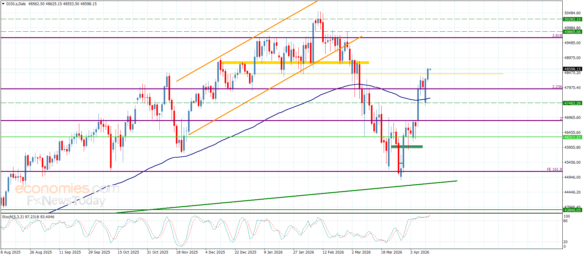 لا مفر حاليا أمام السعر من استئنافه للهجوم الصاعد نظرا لمحاولة تشكيل مستوى 25570.00 لدعم إضافي جديد ولنشير إلى أن ثبات مؤشر ستوكاستيك ضمن مستوى تشبع الشراء سيعزز فرص تسجيله لمكاسب إضافية قد تبدأ من 26040.00 وصولا للقمة التاريخية المتمثلة بمستوى 26295.00.