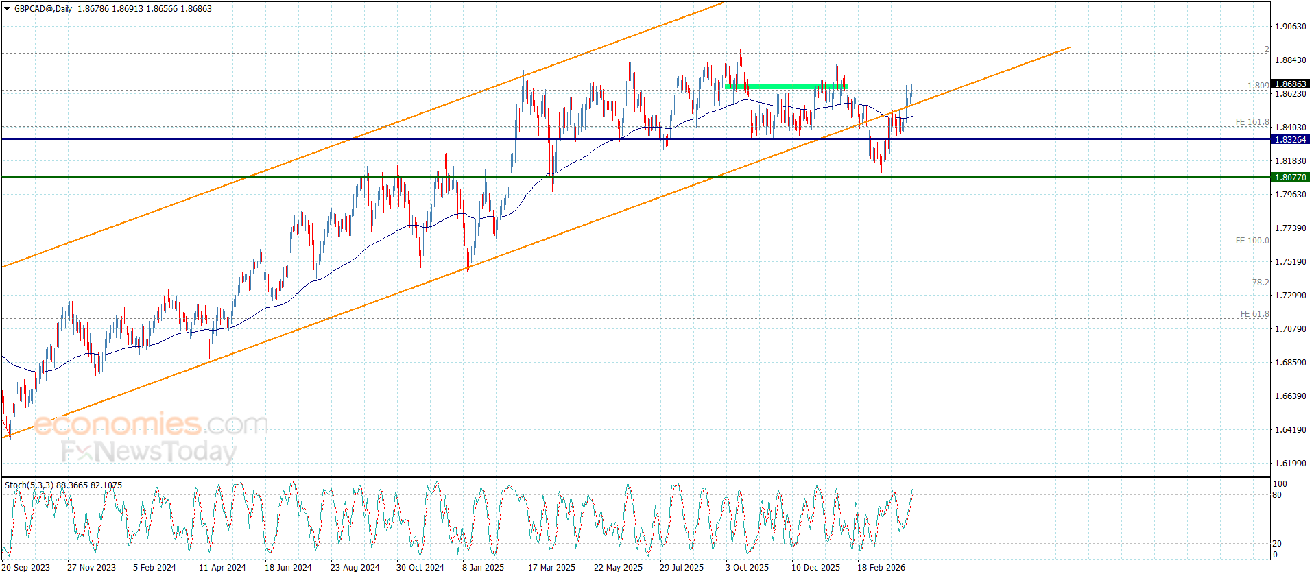 لا مفر حاليا أمام السعر من استئنافه للهجوم الصاعد لنتوقع بتوفر العزم الإيجابي البدء باستهداف محطات إيجابية جديدة قد تبدأ من 1.8745 و1.8810 على التوالي.
