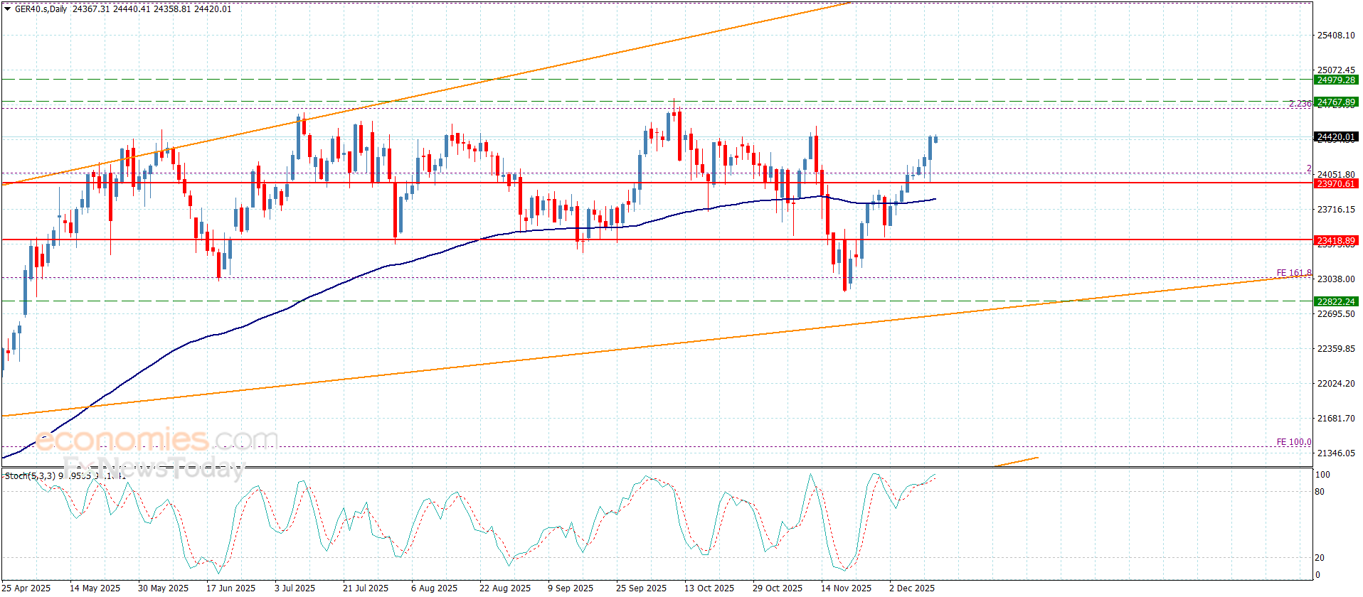 استمر سعر المؤشر بتشكيله لتداولات صاعدة قوية مستغلا ثباته المتكرر فوق الدعم المتمثل بمستوى 23970.00 لنلاحظ تسجيله للأهداف المقترحة بالتقرير السابق بوصوله حاليا نحو 24440.00 ليتقرب من الحاجز التالي المتمركز عند 24465.00.