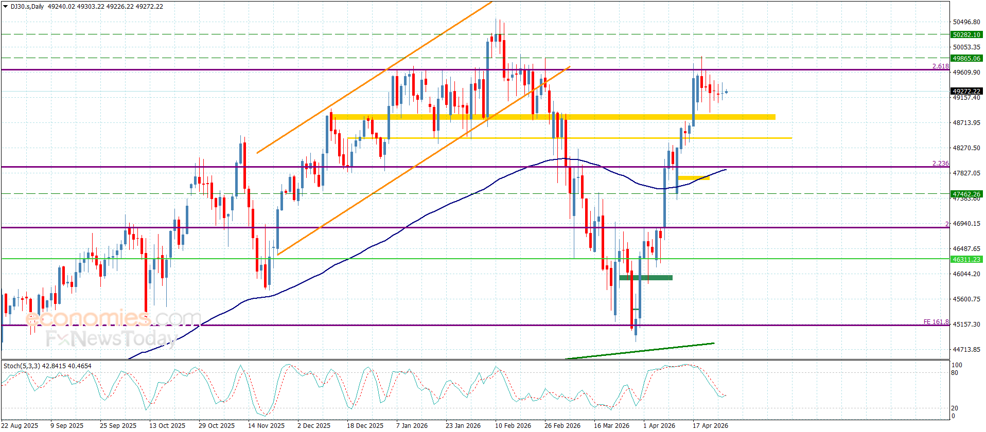 كذلك تعارض المؤشرات الرئيسية المستمر تحديدا بتسلل مؤشر ستوكاستيك دون مستوى 50 يدعم سيطرة الميل الجانبي للتداولات الحالية, ننصح بانتظار تجاوز السعر للحاجز الحالي والثبات أعلاه ليؤكد بذلك استعداده لاستهداف العديد من المحطات الإيجابية والتي قد تبدأ من 49865 و50120 على التوالي, أما كسر الدعم الإضافي سيدفع به لتشكيل موجات تصحيحية هابطة لنتوقع تسلله بذلك نحو 48450.