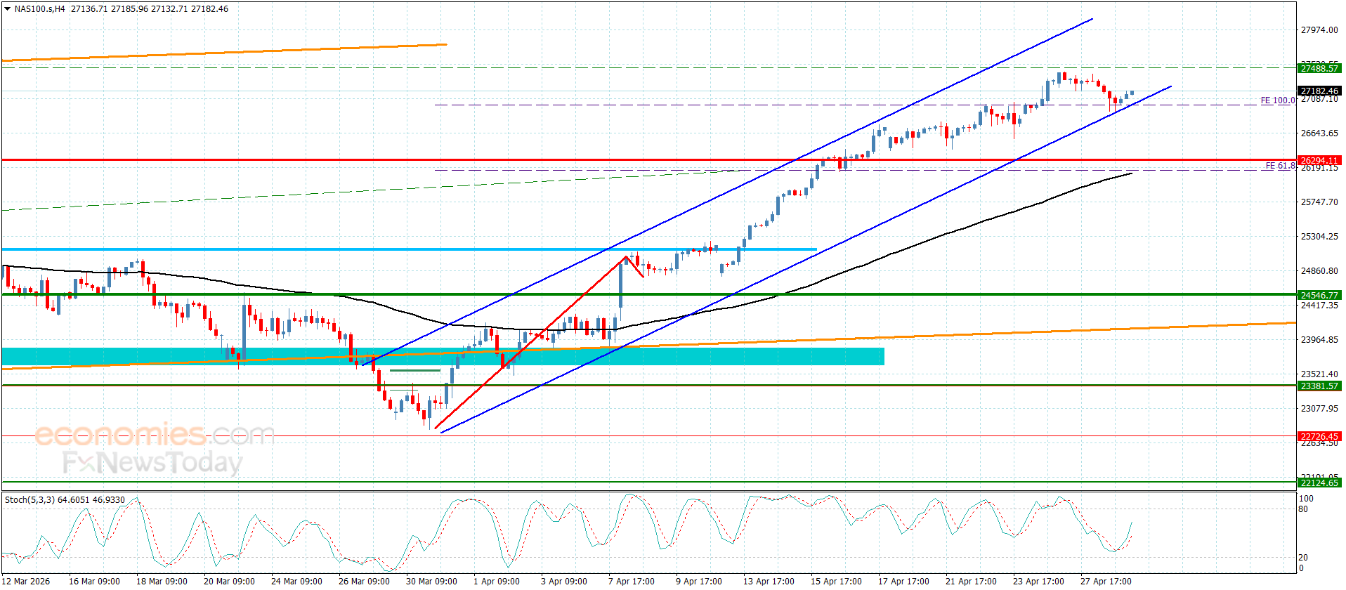 شكّل سعر المؤشر بتداولات يوم أمس بعض الموجات التصحيحية نتيجة لثباته المتكرر دون الحاجز المستقر عند 27488.00 ليبدأ بجني بعض من أرباح بتسلله نحو 26900.00 ليواجه بذلك امتداد دعم القناة الفرعية الصاعدة ومن ثم ليرتد بشكل صاعد ليستقر قرب 27180.00.