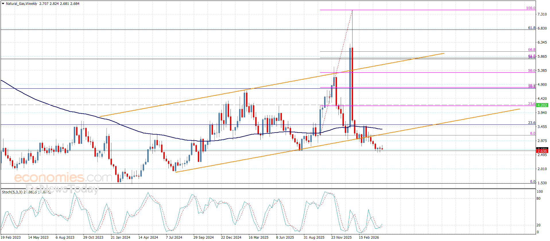 لا يزال سعر الغاز مستقرا حتى هذه اللحظة قرب مستوى الدعم المتمثل بمستوى 2.620$ محاولا إيجاد منفذ لاستئناف الهجوم السلبي المقترح سابقا, نكرر التذكير بأن السيناريو الهابط سيبقى قائم بثبات التداولات المتكرر دون المقاومة الممتدة نحو 3.185$ لنبقى بانتظار تحقيقه لكسر الدعم الحالي ليفتح ذلك باب وصوله للمحطات السلبية الإضافية والتي تتمركز حاليا بمستوى 2.390$ و2.250$ على التوالي.