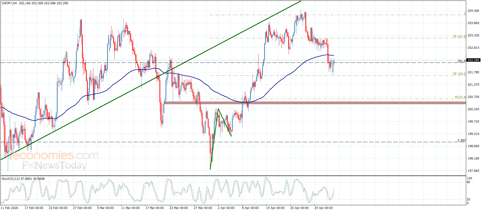 نلاحظ بدء تقديم مؤشر ستوكاستيك للعزم الإيجابي ليزيد من فرص تجديد السعر للمحاولات الصاعدة باستقراره حاليا قرب مستوى 202.25, وباستمرار الضغوط الإيجابية قد ينجح باستئنافه للمحاولات الصاعدة لنتوقع انجذابه قريبا نحو 202.70 ومن ثم ليحاول اختراق العائق المستقر عند 203.25.
