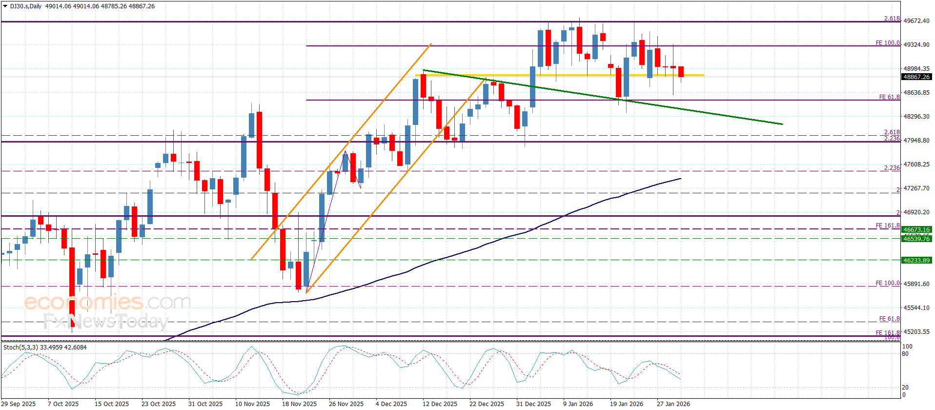 سعر مؤشر الداو جونز يستسلم للضغوط السلبية-توقعات اليوم 30-1-2026