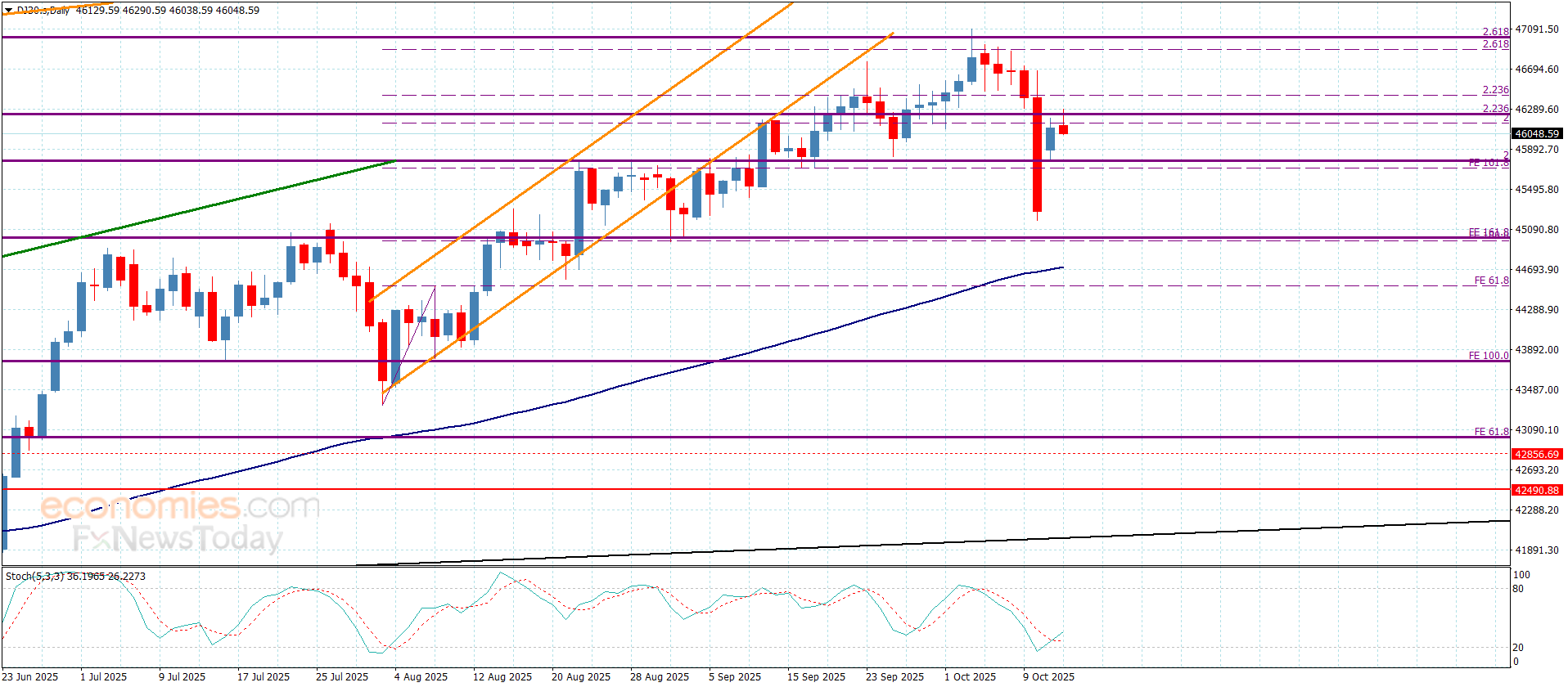 سجّل سعر المؤشر يوم أمس الأهداف الإيجابية باندفاعه نحو 46290 إلا أن افتقاره للعزم الإيجابي دفع به للهبوط مجددا دون الحاجز المستقر عند 46250 ليضطر لتفعيل المسار التصحيحي الهابط من جديد بتسلله حاليا نحو 46000.