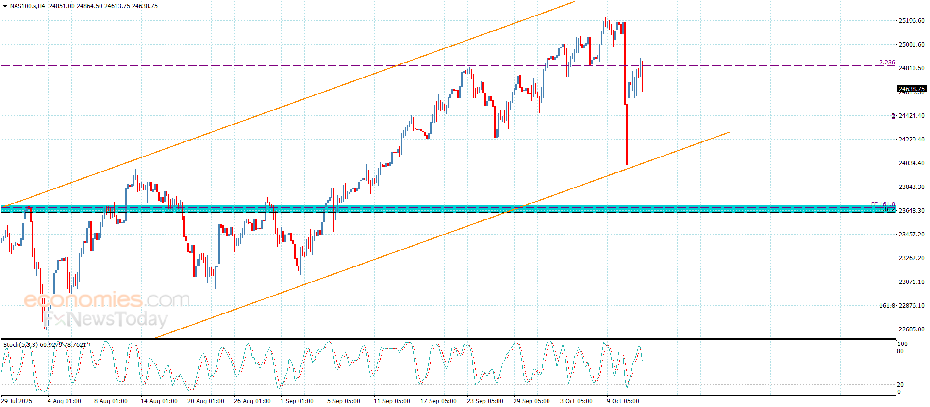 لامس سعر المؤشر باندفاعه الإيجابي الأخير لمستوى 24888.00 إلا أن افتقاره للعزم الإيجابي دفع به للهبوط مجددا دون الحاجز المتمثل بمستوى 24830.00 ليضطر لتشكيل موجات تصحيحية هابطة ليستقر من خلالها قرب 24635.00 كما هو واضح بالرسم المرفق.