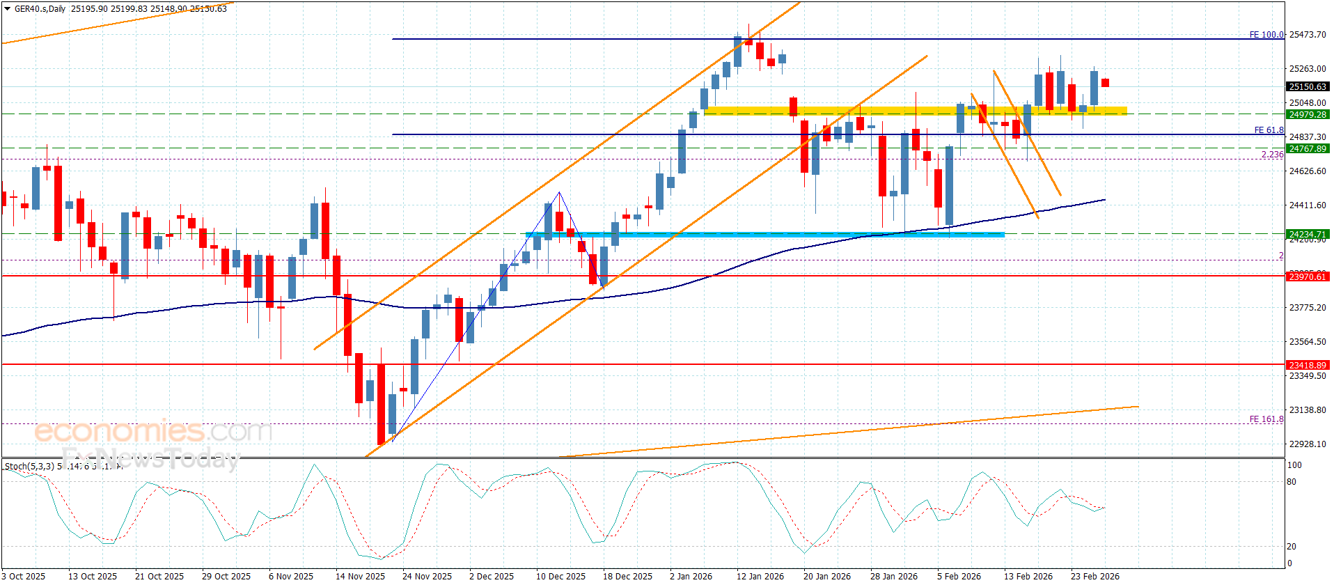 نتوقع تشكيل السعر حاليا لبعض التداولات المختلطة إلا أن اتحاد المؤشرات الرئيسية بتوفيرها للعزم الإيجابي والثبات المتكرر فوق مستوى 25100.00 فإن هذه العوامل تدعو فرص تجديد المحاولات الصاعدة لنتوقع مهاجمته للحاجز المستقر عند 25485.00 وبتجاوزه قد تمتد التداولات نحو 25570.00 و25700.00 على التوالي.