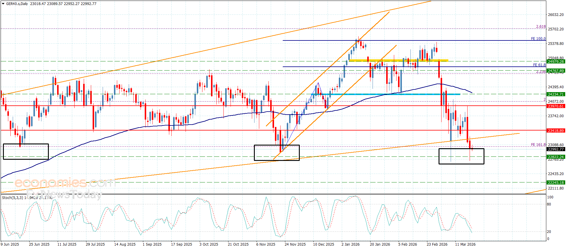 أنهى سعر المؤشر الاندفاع الصاعد الأخير بتسجيله للهدف المستقر عند 23970.00 والذي يشكل بدوره مقاومة قوية ليجبره ذلك على تجديد المحاولات السلبية لنلاحظ تكبده لخسائر كبيرة بتسلله نحو 22740.00 ليواجه بذلك دعم تاريخي سابق.