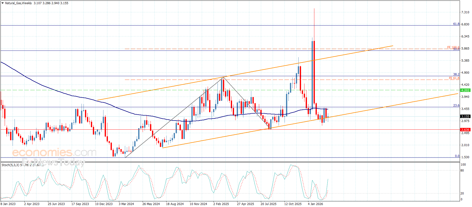 بالرغم من ضعف تداولات سعر الغاز الأخير إلا أن ارتكازه السلبي المتكرر دون الحاجز المتمثل بمستوى 3.450$ يدعم فرص تجديده للهجوم السلبي خلال الفترة القريبة, نؤكد على أهمية تجميع السعر للعزم السلبي ليمكنه ذلك من تجديد الضغط على مستوى 2.820$ ومن ثم لتمتد التداولات نحو الهدف التالي المستقر عند 2.620$.
