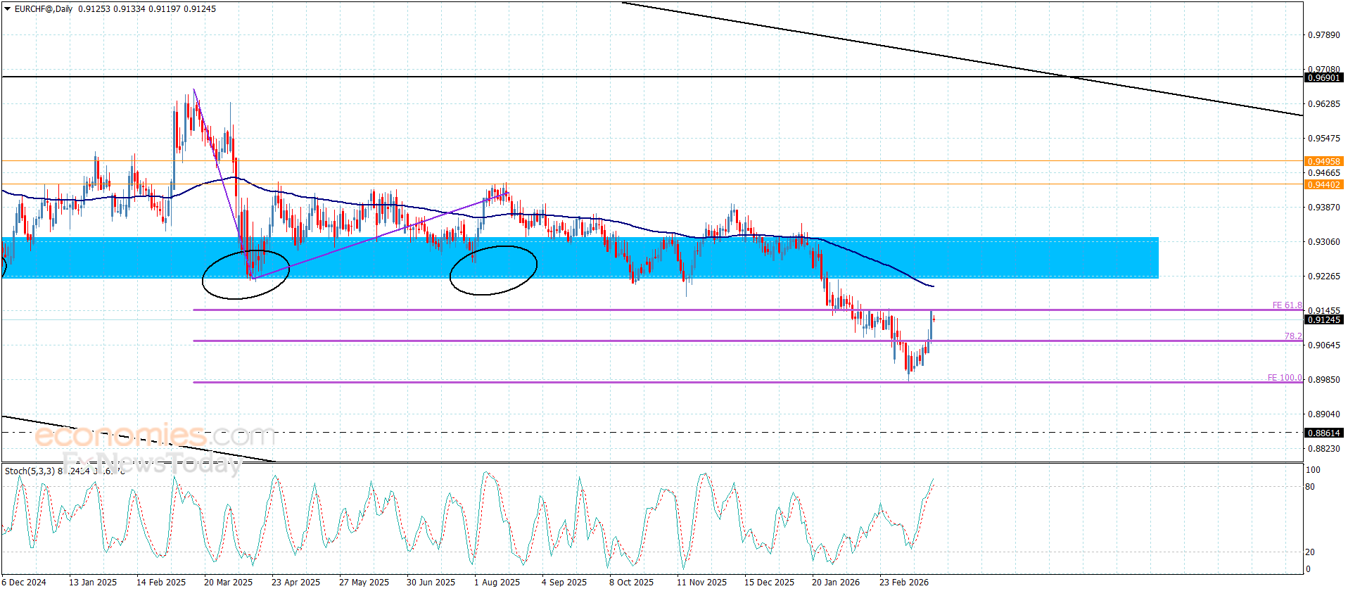 نشير إلى أن استمرار تمركز السعر دون الحاجز الحالي سيزيد من فرص تفعيل المحاولات السلبية لنتوقع تسلله قريبا نحو 0.9075 وصولا نحو 0.9010, أما اختراق الحاجز سيجبره على تأجيل الهبوط واستهداف محطات تصحيحية إضافية قد تمتد نحو 0.9185 و0.9220 على التوالي.