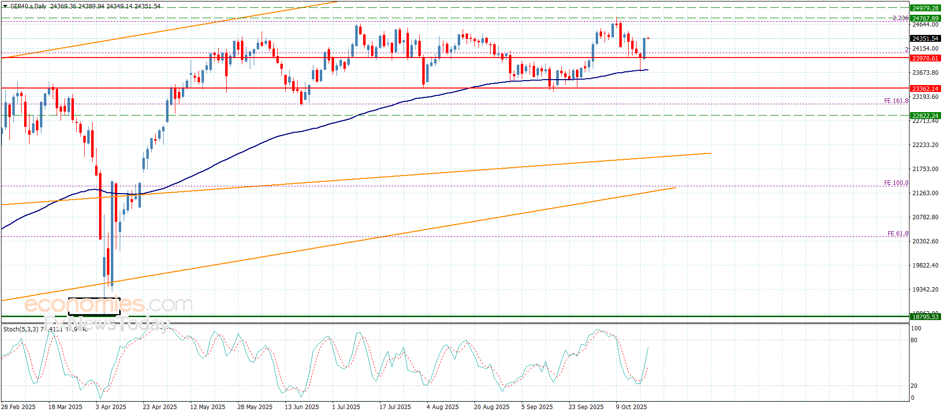 نجح سعر المؤشر بالصمود فوق مستوى 23970.00 ليعزز ذلك من سيطرة الميل الصاعد المقترح سابقا ولنلاحظ تسجيله لبعض المكاسب بملامسته لمستوى 24365.00.