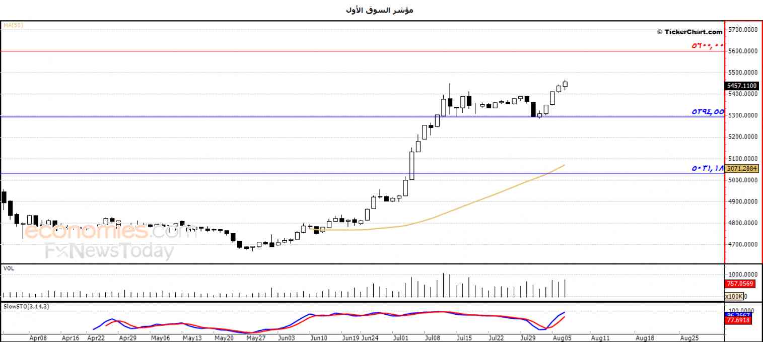 أغلق مؤشر السوق الأول على ارتفاع جديد ليحقق بذلك أرباحاً بلغت نسبتها 0.36% بما يعادل 19.55 نقطة ، في ظل تواصل الضغط الإيجابي للمتوسط المتحرك البسيط لفترة 50 يوماً السابقة ، مع توارد الإشارات الإيجابية بمؤشرات القوة النسبية ، وسيطرة الموجة التصحيحية الصاعدة على المدى القصير .