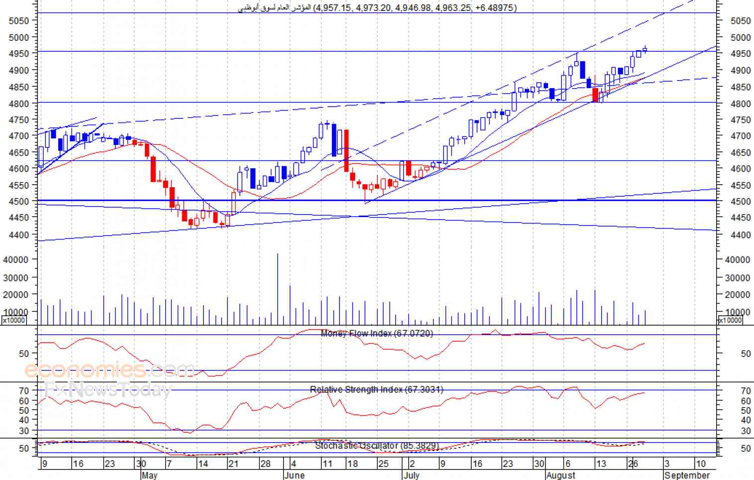انهى المؤشر تداولات أمس الأربعاء في المنطقة الخضراء، حيث اغلق عند مستوى 4963 نقطة، وهو أعلى مستوى يصل اليه المؤشر منذ شهر نوفمبر من عام 2014 نقطة، مستقرا أعلى متوسطه المتحرك لـ 10 و20 يوم، لذلك نتوقع ان يمدد المؤشر مكاسبه في الاجل القصير لمستوى المقاومة التالي عند 2070 نقطة، ومع ذلك نحذر من عودة المؤشر مرة أخرى أسفل مستوى 4900 نقطة، حيث في هذه الحالة سيعيد اختبار مستوى الدعم 4800 نقطة.