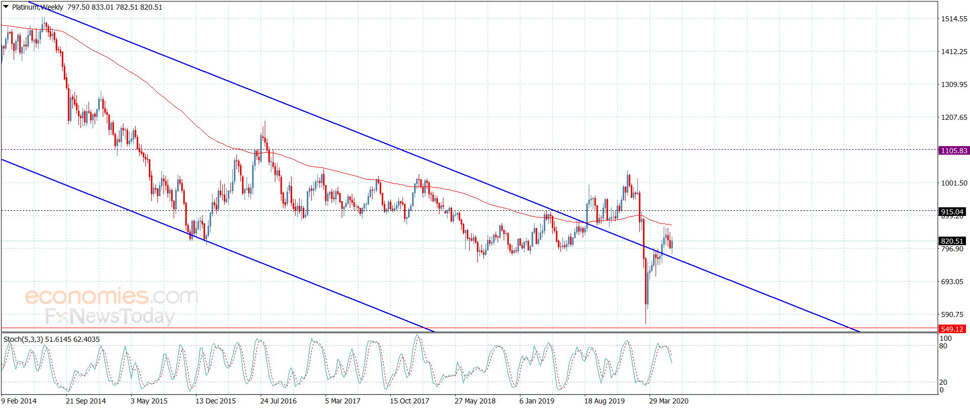 لا جديد لدى سعر البلاتين بتعرضه لضغوط سلبية بدأ من ثبات المتوسط المتحرك 55 فوق التداولات الحالية ليدعم تشكيل مستوى 875.00 لحاجز قوي, إضافة لخروج مؤشر ستوكاستيك من مستوى تشبع الشراء ليفعل ذلك سيطرة الميل الجانبي ولنتوقع انحصار التداولات حاليا ما بين 850.00 و 790.00.