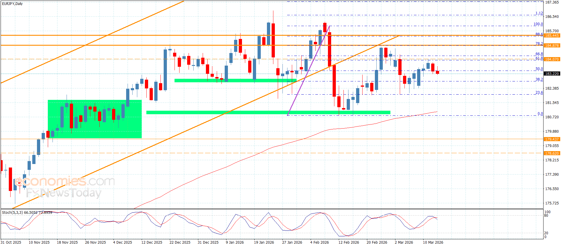 نشير إلى أن تمركز مؤشر ستوكاستيك المستمر دون مستوى 80 قد يدفع بالسعر لتقديم المزيد من التداولات السلبية ليحاول استهداف مستوى 182.45 وصولا لمستوى تصحيح 23.6% فيبوناتشي المستقر قرب 182.00, أما اندفاعه مجددا فوق 184.40 سيؤكد انتقاله للمسار الإيجابي ليحاول تحقيق العديد من المكاسب باندفاعه أولا نحو 184.80 و185.45 على التوالي.