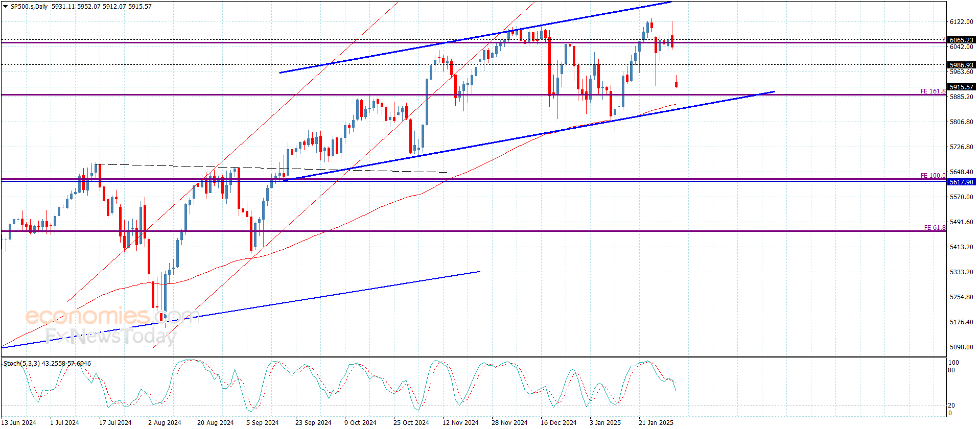 افتتح سعر المؤشر تداولات هذا اليوم بتشكيله لفجوة سلبية قوية ليستقر من خلالها قرب مستوى 5915.00 معلنا تأجيله للاندفاع الصاعد بالرغم من تمركزه المستمر ضمن محاور القناة الصاعدة والموضحة بالرسم المرفق.