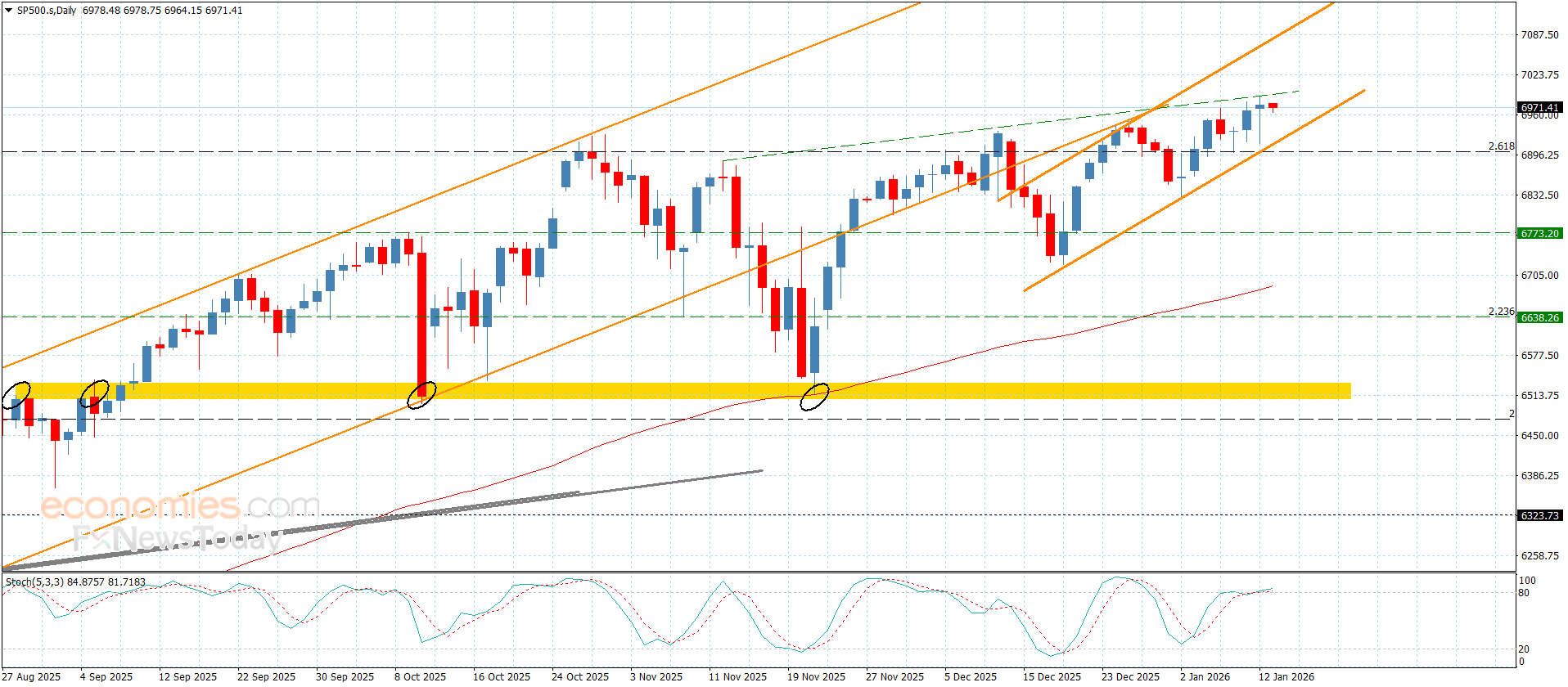 أكد سعر المؤشر تمسكه بالسيناريو الصاعد بتقديمه يوم أمس لإغلاق إيجابي جديد فوق دعم القناة الفرعية الصاعدة والممتد حاليا نحو 6918.00 لنلاحظ محاولة تحقيقه لبعض المكاسب باندفاعه نحو 6990.00 ليقترب بذلك من الحاجز النفسي المتمركز عند 7000.00.