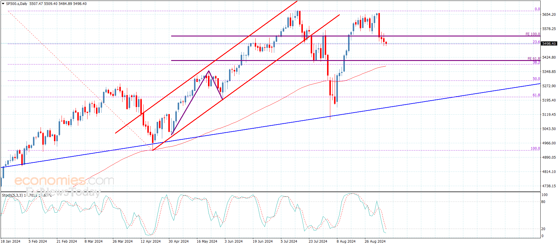 شكّل سعر المؤشر بتداولات يوم أمس المزيد من الموجات السلبية ليحافظ على مساره التصحيحي الهابط باستقراره دون الحاجز المتمركز عند 5570.00 ولنلاحظ تقديمه حاليا لضغوط سلبية على مستوى تصحيح 23.6% فيبوناتشي المتمركز عند 5500.00.