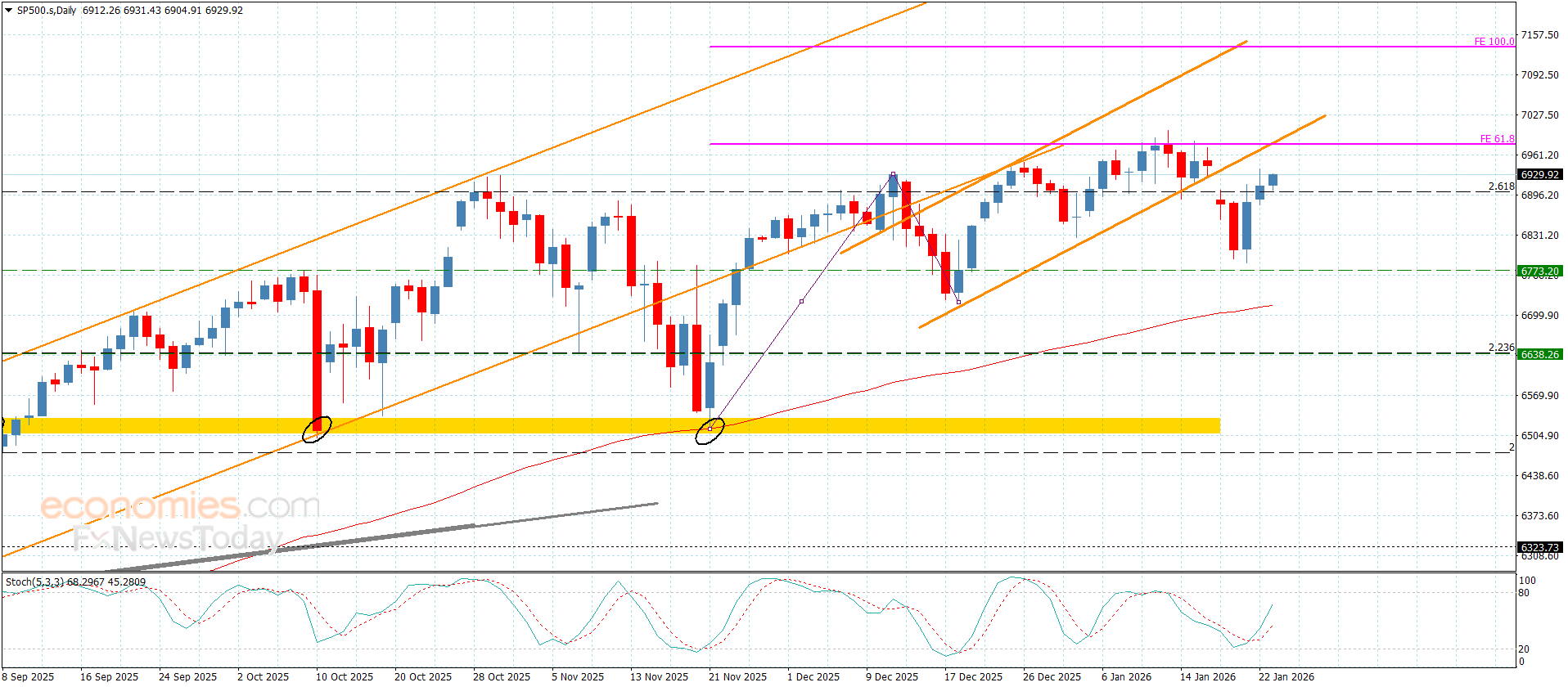 تفاعل سعر المؤشر مجددا مع الضغوط الإيجابية باندفاعه يوم أمس فوق الحاجز المتمثل بمستوى 6900.00 لنلاحظ بدء تشكيله لموجات صاعدة بتسجيله للهدف الأول المستقر عند 6930.00 وليستقر قربه.
