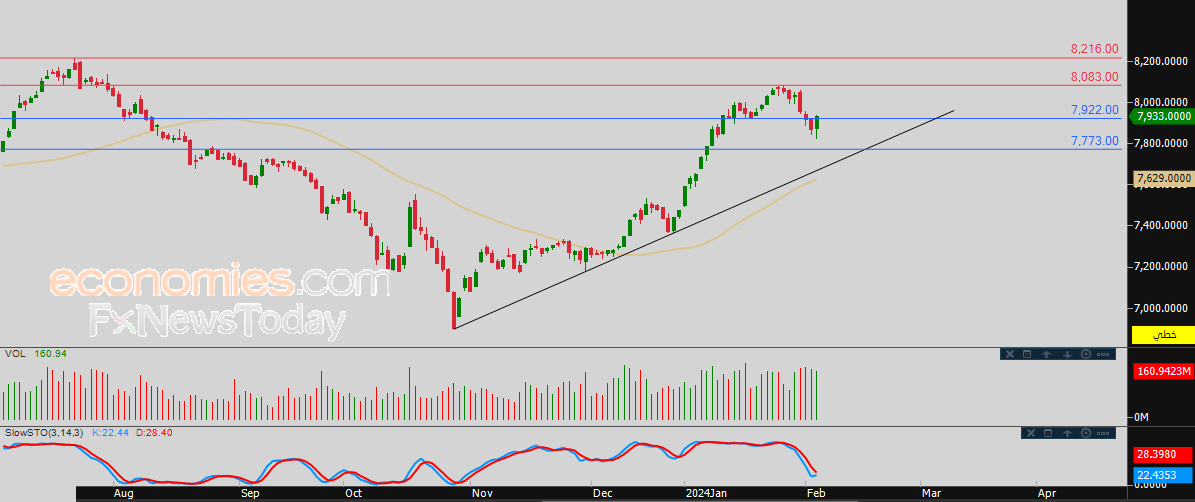 نطاق التداول المتوقع لهذا اليوم ما بين مستوى الدعم 7,773.00 ومستوى المقاومة 8,083.00.