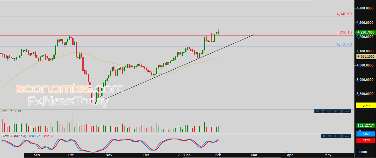 لذلك نحن نتوقع المزيد من الصعود للمؤشر خلال تداولاته القادمة، خاصة طوال استقراره فوق مستوى 4,210.10، ليستهدف أولى مستويات المقاومة عند 4,340.60.