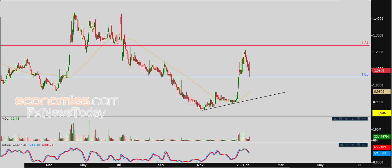 لهذا فتوقعاتنا ترجح عودة ارتفاع السهم خلال تداولاته القادمة، خاصة في حالة ثبات مستوى الدعم 1.05، ليستهدف من جديد مستوى المقاومة 1.24.