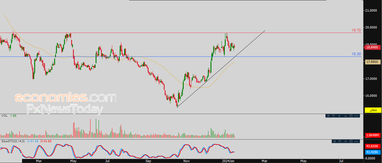 لذلك نحن نرجح عودة ارتفاع السهم خلال تداولاته القادمة، طيلة ثبات الدعم 18.30، ليستهدف مستوى المقاومة المحوري 19.70.