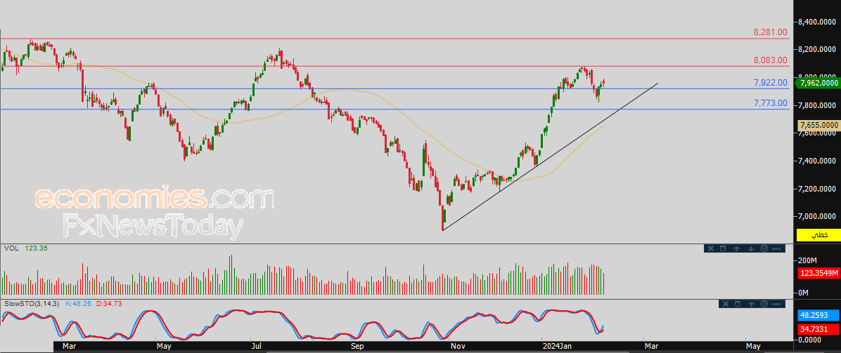 نطاق التداول المتوقع لهذا اليوم ما بين مستوى الدعم 7,800.00 ومستوى المقاومة 8,083.00.