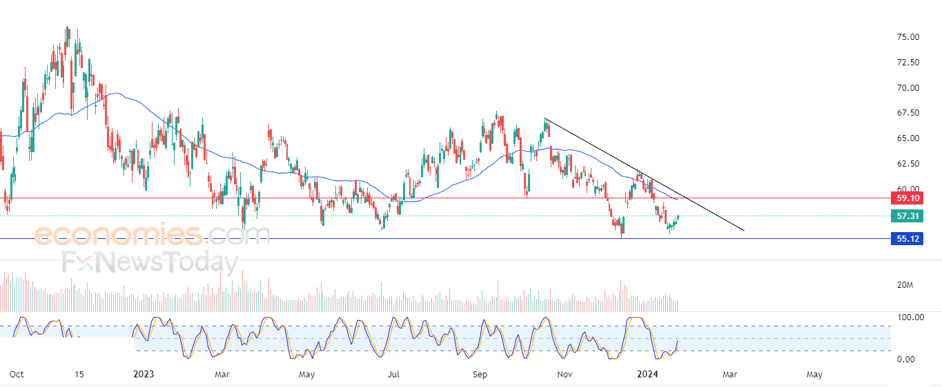 لذلك نحن نرجح عودة انخفاض السهم خلال تداولاته القادمة، طيلة ثبات المقاومة 59.10، ليستهدف مستوى الدعم المحوري 55.12.