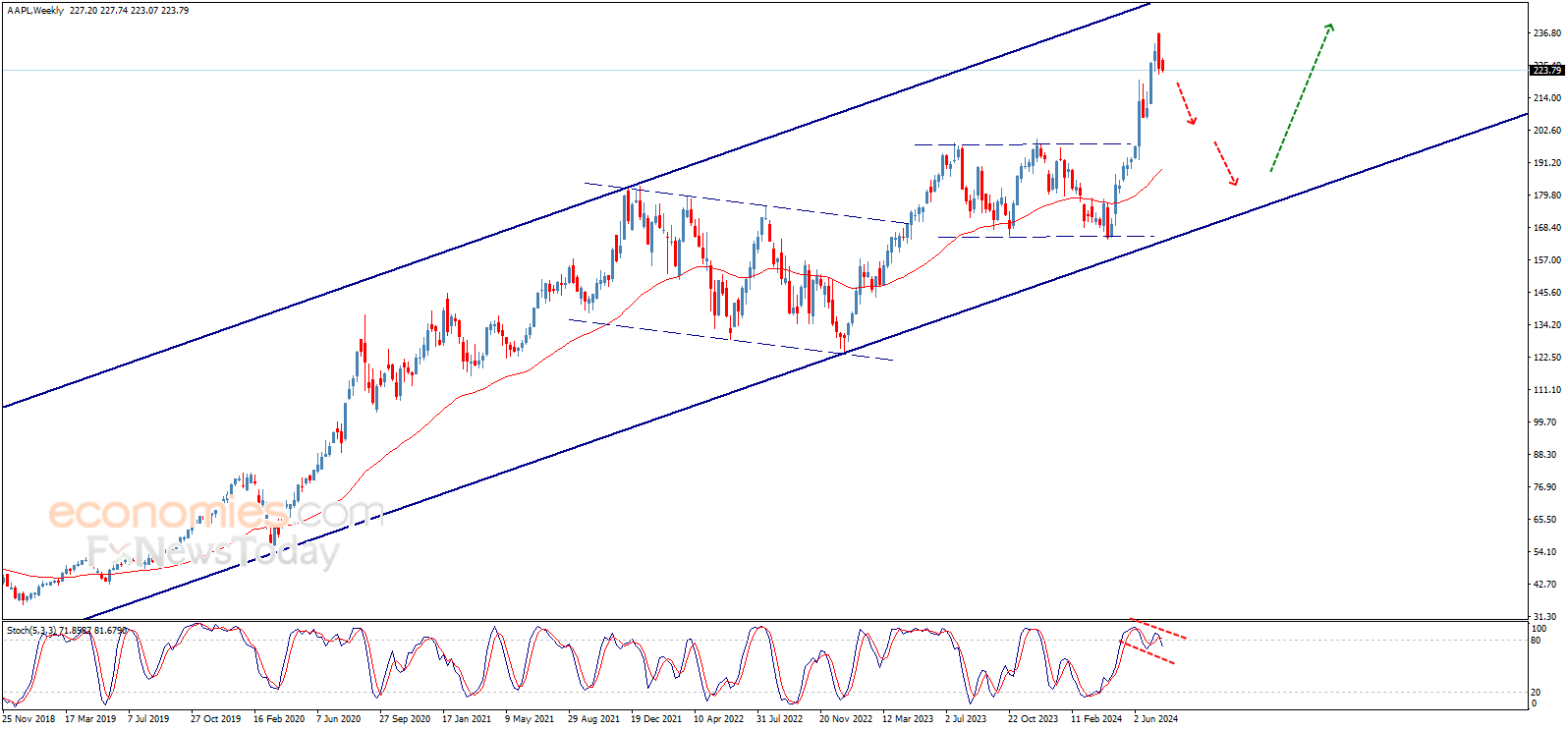 منذ أكثر من عشرة أعوام وسهم شركة أبل (Apple Inc.) يسير في اتجاه رئيسي صاعد، تخلّله بعض الانخفاضات المؤقتة والتحرّكات الجانبية في بعض الفترات، وبالنظر إلى الرسم البياني الأسبوعي، نجد بأن السهم يتحرّك داخل قناة صاعدة طويلة الأمد، تحمل السعر لتحقيق مزيد من المكاسب المتوقعة للفترة القادمة.