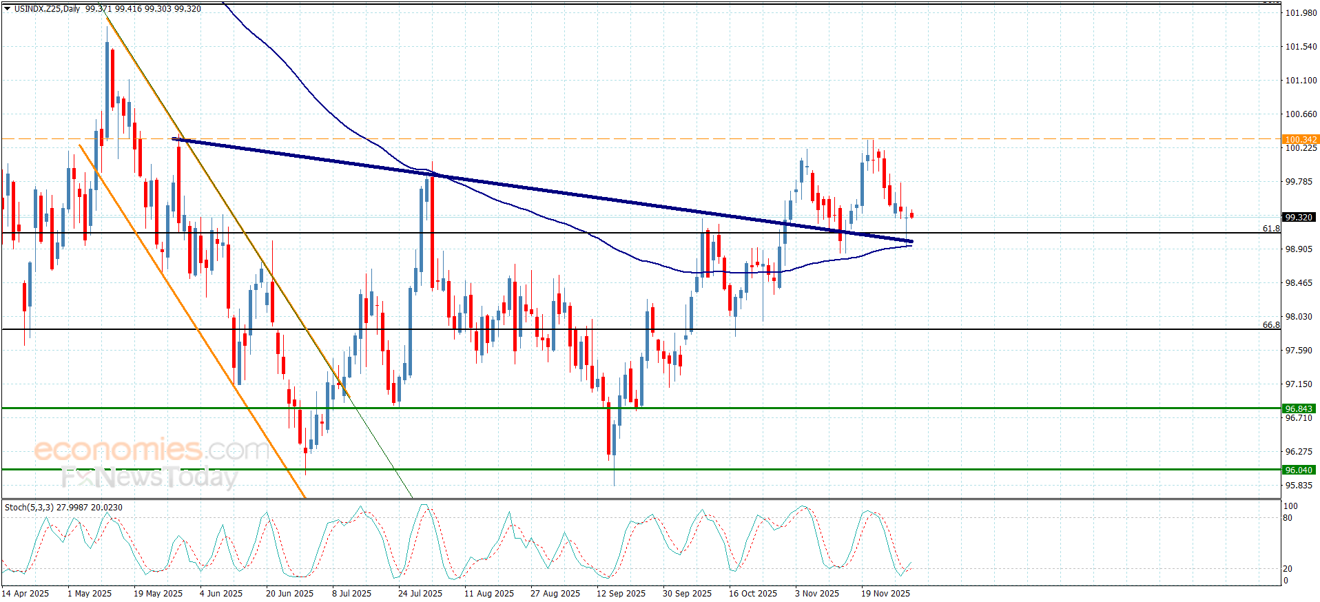 تصدى سعر المؤشر بتداولات يوم أمس للضغوط السلبية الإضافية لنلاحظ تقديمه لإغلاق إيجابي جديد فوق الدعم المتمركز قرب 98.85 مستغلا إيجابية محور المتوسط المتحرك 55 لنلاحظ اندفاعه مباشرة نحو 99.35.