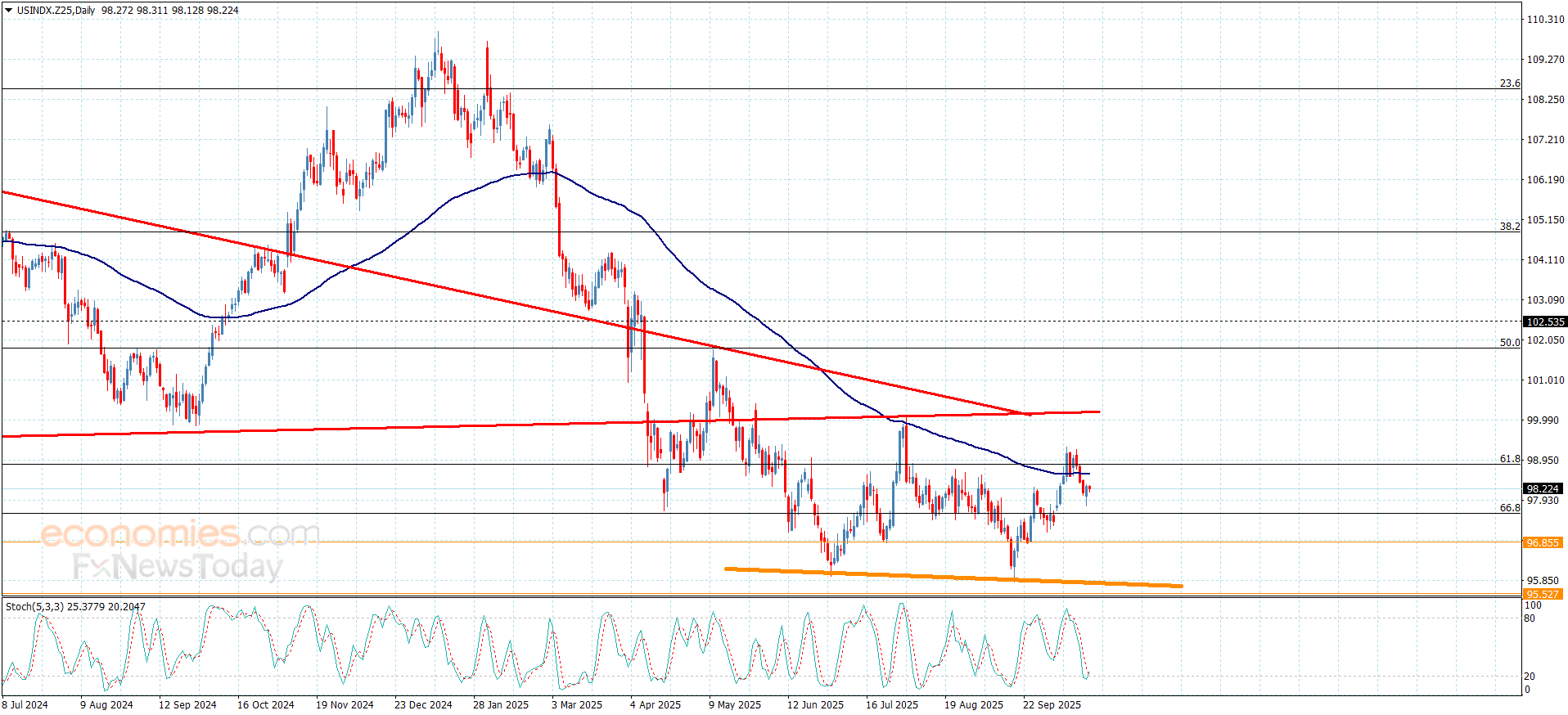 فقد سعر المؤشر العزم السلبي بمحاولة خروج مؤشر ستوكاستيك من مستوى تشبع البيع لينهي الهجوم السلبي بملامسته لمستوى 97.75 ومن ثم لنلاحظ تشكيله لارتداد إيجابي مؤقت بتذبذبه قرب 98.30.