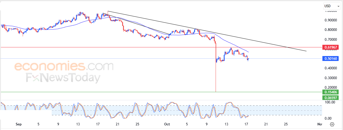 لهذا تشير توقعاتنا إلى انخفاض سعر العملة خلال تداولاته اللحظية القادمة، طيلة ثبات مستوى المقاومة 0.61967$، ليستهدف مستوى الدعم 0.15406$.