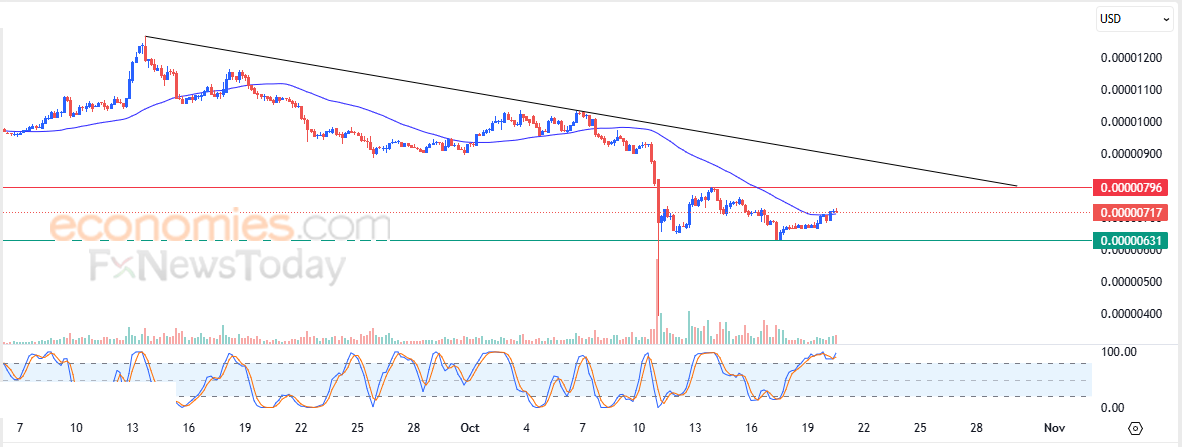لذلك فتوقعاتنا تميل نحو هبوط سعر العملة خلال تداولاته اللحظية القادمة، طيلة ثبات مستوى المقاومة 0.00000796$، ليستهدف مستوى الدعم 0.00000631$.