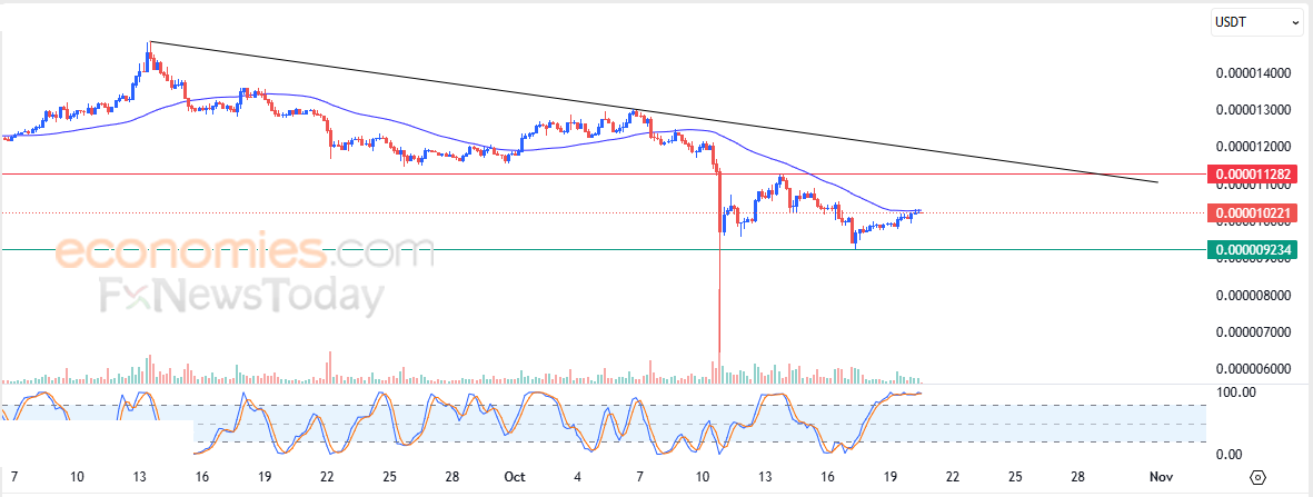 لذلك فتوقعاتنا تشير إلى هبوط سعر العملة خلال تداولاته اللحظية القادمة، طيلة ثبات مستوى المقاومة 0.000011282، ليستهدف مستوى الدعم 0.000009234.
