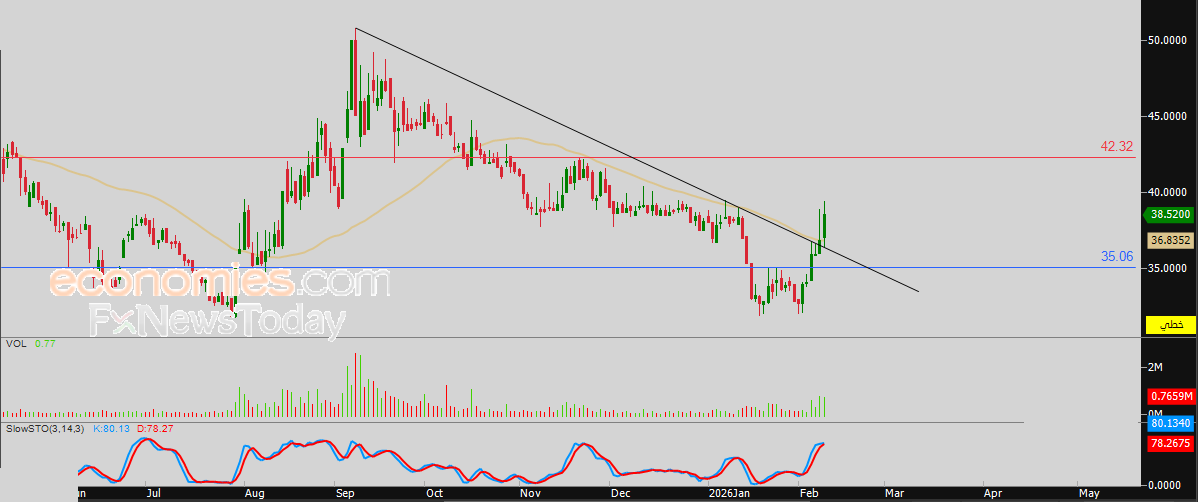 لهذا فتوقعاتنا تشير إلى صعود سعر السهم خلال تداولاته القادمة، طيلة ثبات مستوى الدعم 35.00 ريال، ليستهدف مستوى المقاومة 42.30 ريال.