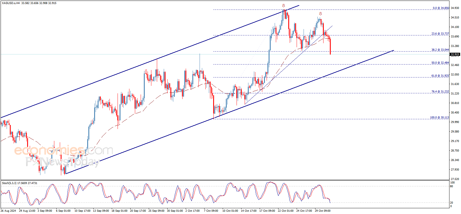 نجح سعر الفضة بتحقيق هدفنا المنتظر عند 33.04$ ويضغط عليه في محاولة لتأكيد كسره، ونلاحظ أن السعر يكمل تشكيل نموذج قمة مزدوجة يملك أهداف سلبية تتخطّى 32.50$ لتصل إلى 31.95$، ليبقى الميل الهابط مسيطراً خلال الجلسات القادمة بثبات السعر دون مستوى 33.70$ والثبات فوقه.