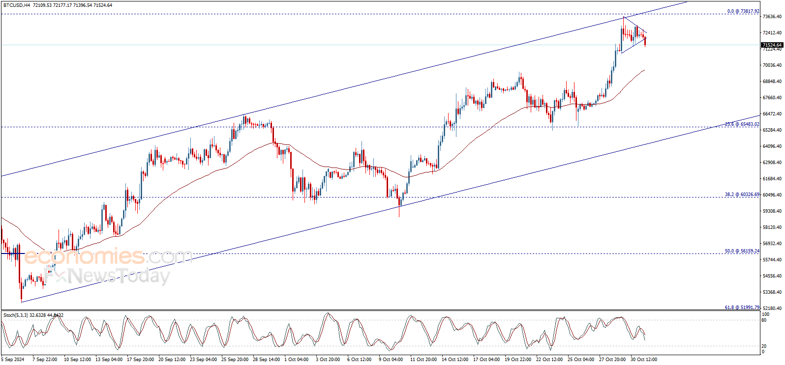 يتداول سعر البتكوين (BTCUSD) بسلبية ملحوظة ليكسر مستوى 71475.00$ ويتجه نحو تحوّل محتمل في الاتجاه اللحظي نحو الانخفاض، مع الإشارة إلى أن ثبات السعر دون هذا المستوى سيضغط على السعر لإجراء تصحيح هابط يستهدف مستويات 70555.00$ ثم 69605.00$ كمحطات سلبية أولية، في حين إن اختراق 71475.00$ والتداول فوقه من جديد سيعيد تفعيل الموجة الصاعدة التي يتواجد هدفها الأول عند 73818.00$ وتمتد إلى 76480.00$.