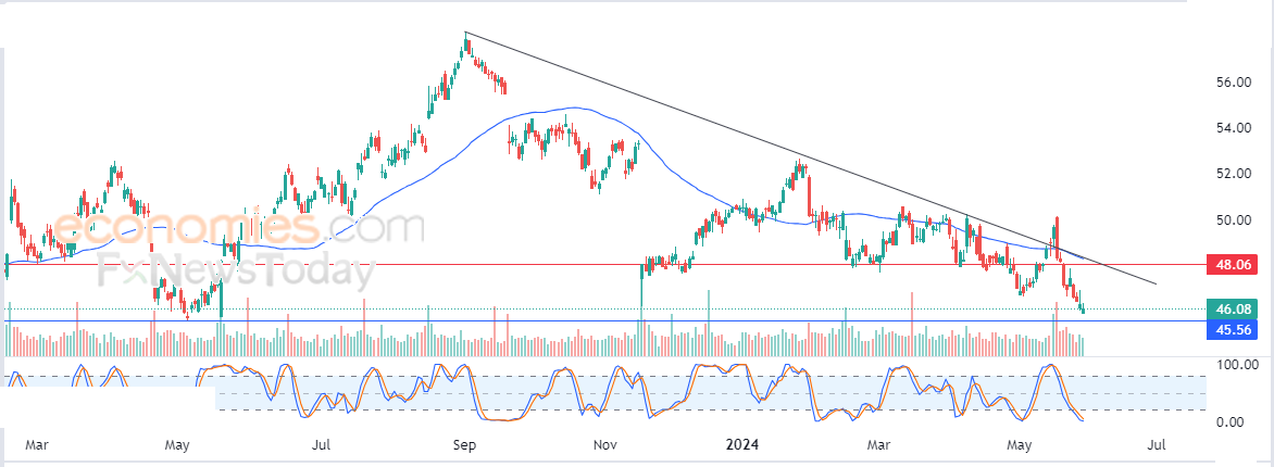 لهذا فتوقعاتنا تشير إلى استمرار هبوط سعر السهم خلال تداولاته القادمة، ليستهدف مستوى الدعم المحوري والقريب 45.56$، طيلة ثبات مستوى المقاومة 47.66$.