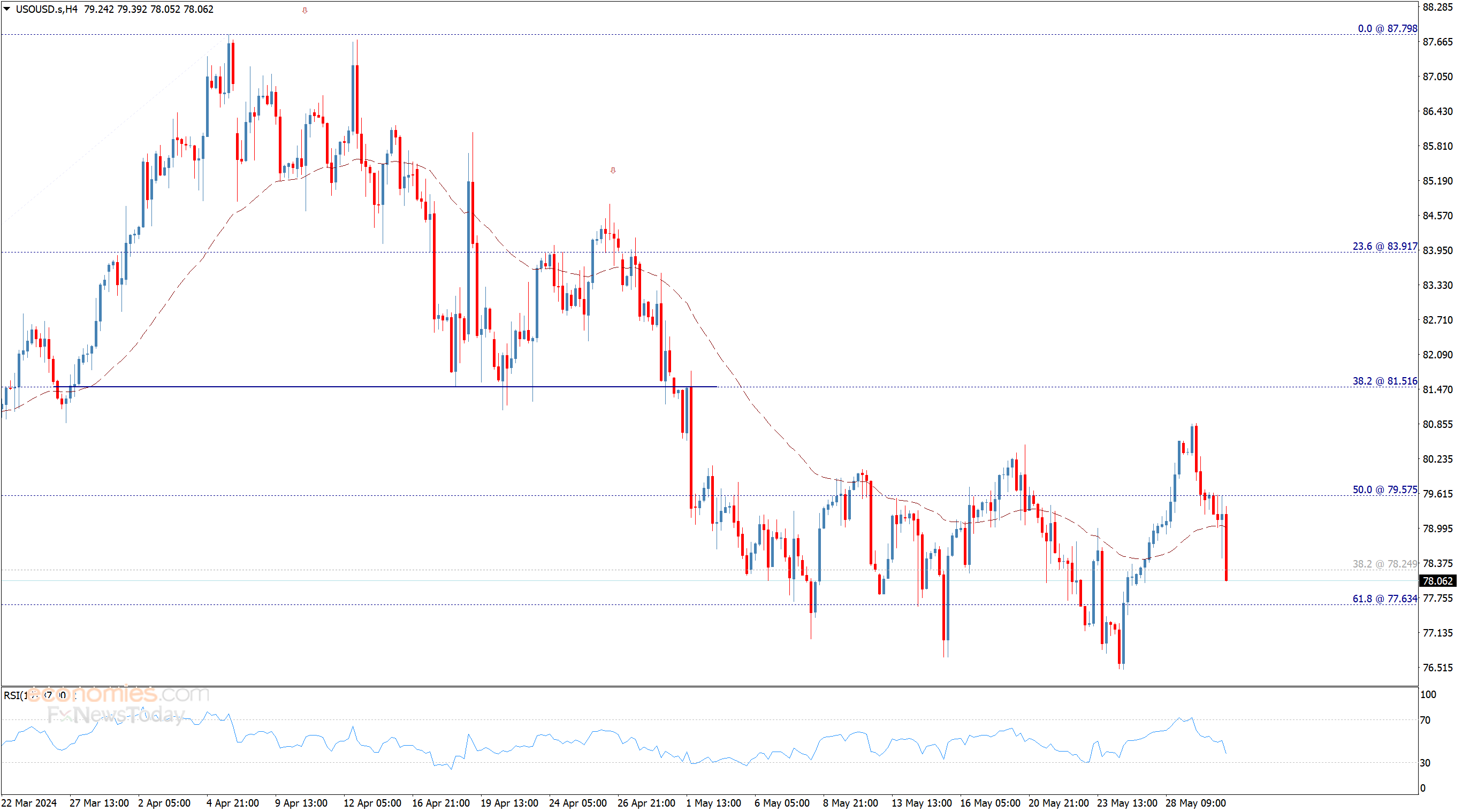 يتداول سعر النفط بسلبية قوية ليقترب من الهدف المنتظر عند 77.64$، ويبدو المجال مفتوحاً أمام تجاوز هذا المستوى لفتح الطريق أمام تكبّد خسائر إضافية على المدى القصير، مع الإشارة إلى أن الاتجاه الهابط سيبقى فعالاً ما لم يندفع السعر لاختراق مستوى 79.60$ والثبات فوقه.