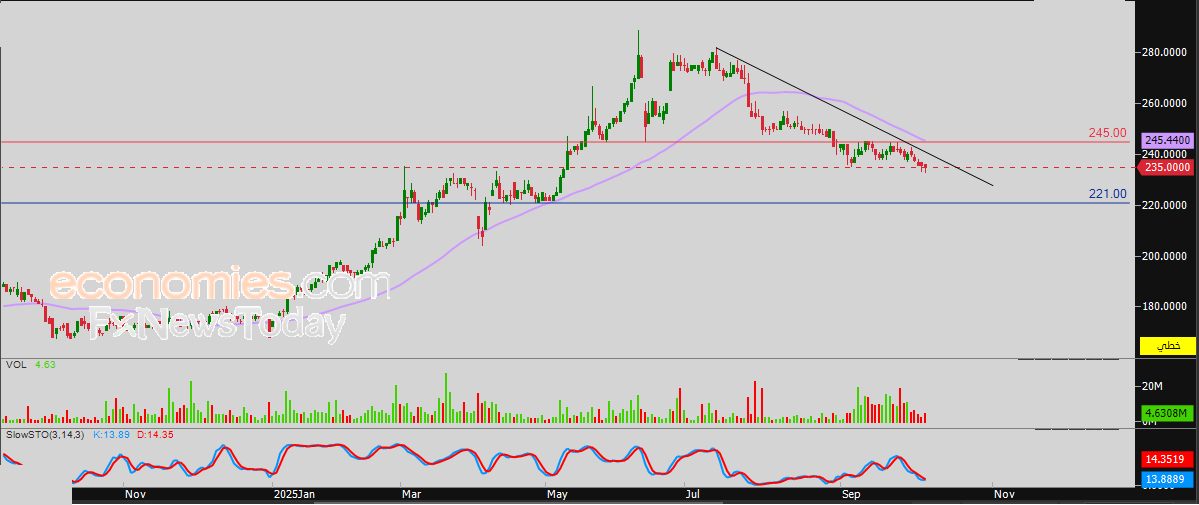 لذلك فتوقعاتنا تشير إلى هبوط سعر السهم خلال تداولاته القادمة، طيلة ثبات مستوى المقاومة 245.00 دينار، ليستهدف مستوى الدعم 221.00 دينار.