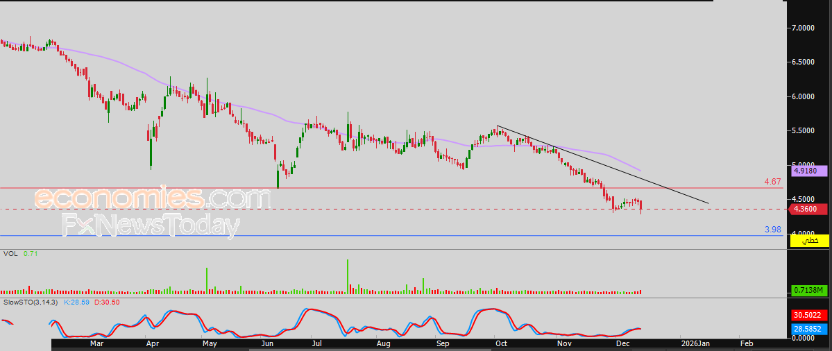 لذلك تشير توقعاتنا إلى هبوط سعر السهم خلال تداولاته القادمة، طيلة ثبات مستوى المقاومة 4.67 ريال، ليستهدف مستوى الدعم 3.98 ريال.