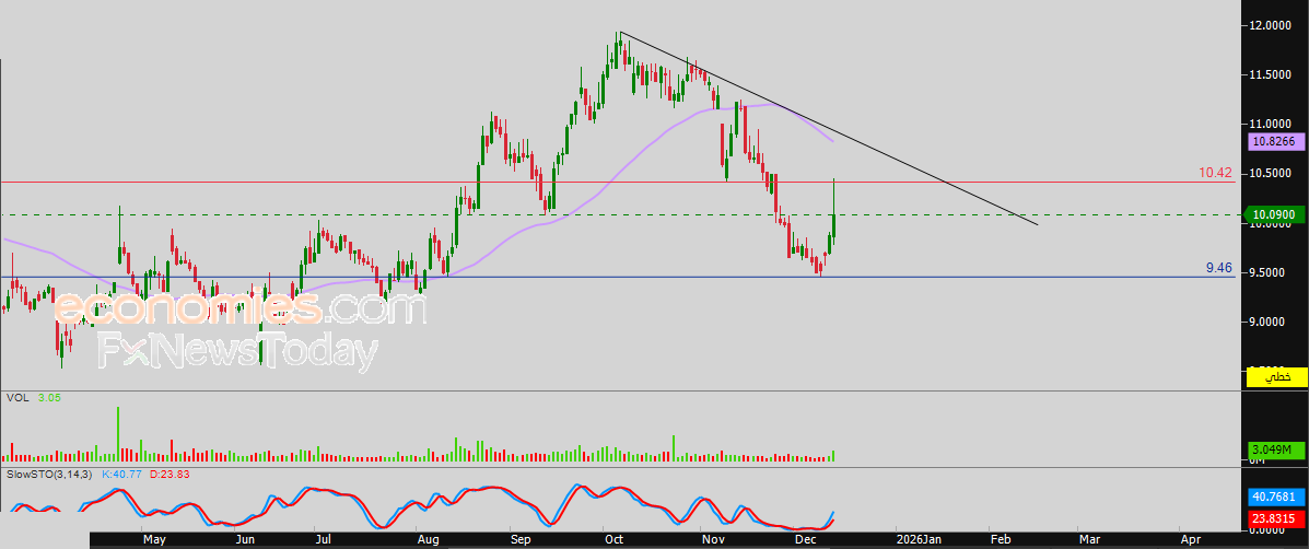 لهذا فتوقعاتنا تميل نحو انخفاض سعر السهم خلال تداولاته القادمة، طيلة ثبات مستوى المقاومة 10.42 ريال، ليستهدف مستوى الدعم 9.46 ريال.
