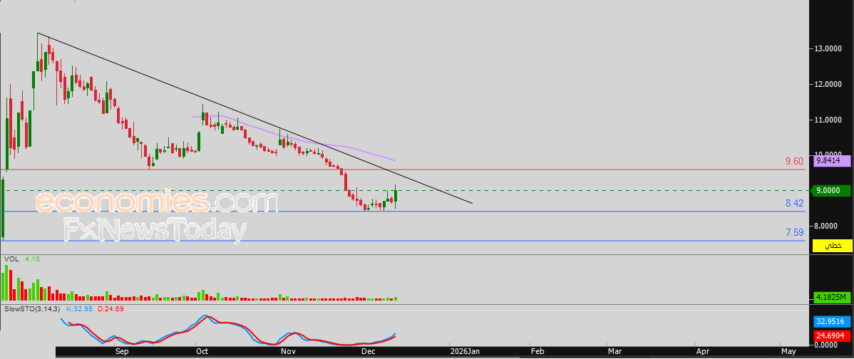 لهذا تميل توقعاتنا إلى انخفاض سعر السهم خلال تداولاته القادمة، طيلة ثبات مستوى المقاومة 9.60 ريال، ليستهدف من جديد مستوى الدعم 8.42 ريال استعداداً لكسره.