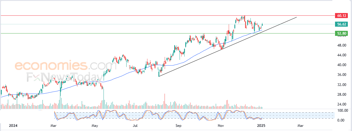 لهذا نحن نتوقع المزيد من الصعود لسعر السهم خلال تداولاته القادمة، بشرط ثبات مستوى الدعم 52.80$، ليستهدف مستوى المقاومة المحوري والقريب 60.12$ استعداداً لمهاجمته.