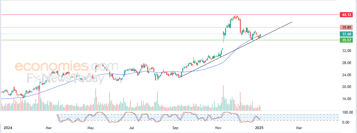 لذلك فتوقعاتنا تشير إلى ارتفاع سعر السهم خلال تداولاته القادمة، طيلة ثبات مستوى الدعم المحوري 35.57$، ليستهدف مستوى المقاومة 44.12$ الذي يمثل آخر قمة للسهم.