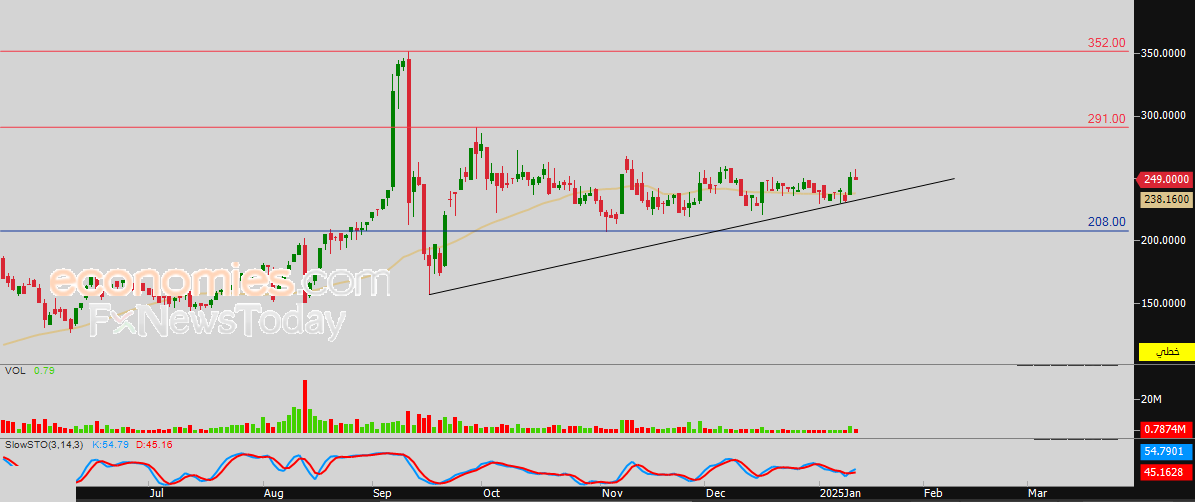 لذلك نحن نرجح عودة صعود سعر السهم خلال تداولاته القادمة، طيلة ثبات مستوى الدعم 208.00 دينار، ليستهدف مستوى المقاومة 291.00 دينار.