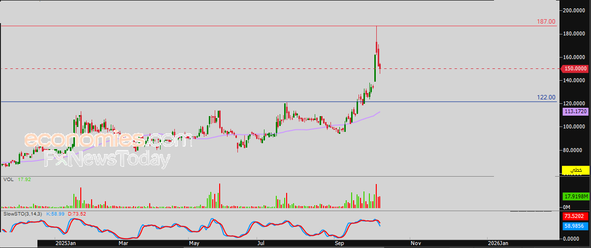 لهذا فتوقعاتنا تشير إلى صعود سعر السهم خلال تداولاته القادمة، طيلة ثبات مستوى الدعم 122.00 دينار، ليستهدف مستوى المقاومة 187.00 دينار.