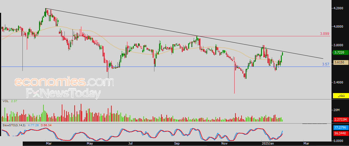 لذلك فتوقعاتنا ترجح المزيد من الصعود لسعر السهم خلال تداولاته القادمة، طيلة ثبات مستوى الدعم 3.57 ريال، ليستهدف مستوى المقاومة 3.899 ريال.