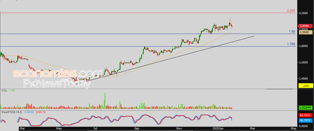 لهذا فتوقعاتنا ترجح عودة صعود سعر السهم خلال تداولاته القادمة، طيلة ثبات مستوى الدعم 1.95 ريال، ليستهدف مستوى المقاومة 2.205 ريال.